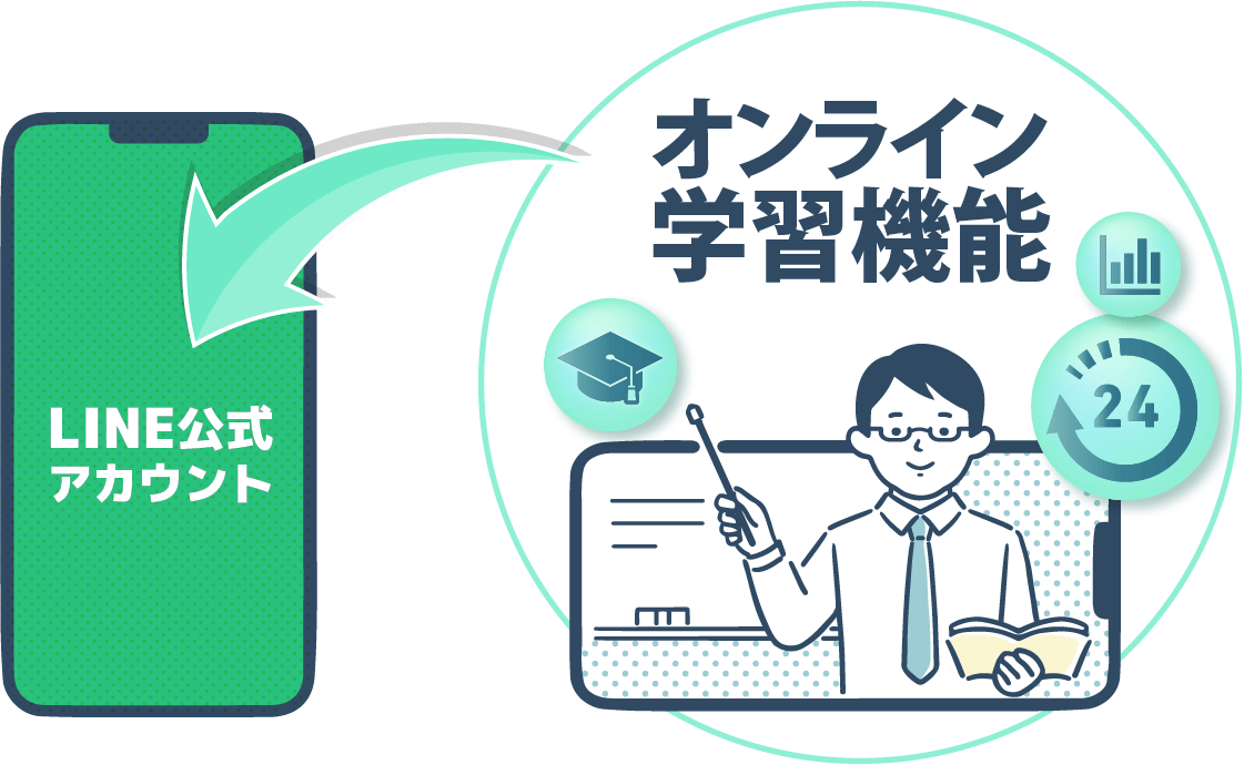LINE公式アカウントと連携することで、多機能になるLINEツールのシステムを使いLINE内で、オンラインスクールやE-learningなどのオンラインレッスンを構築できるようになります。